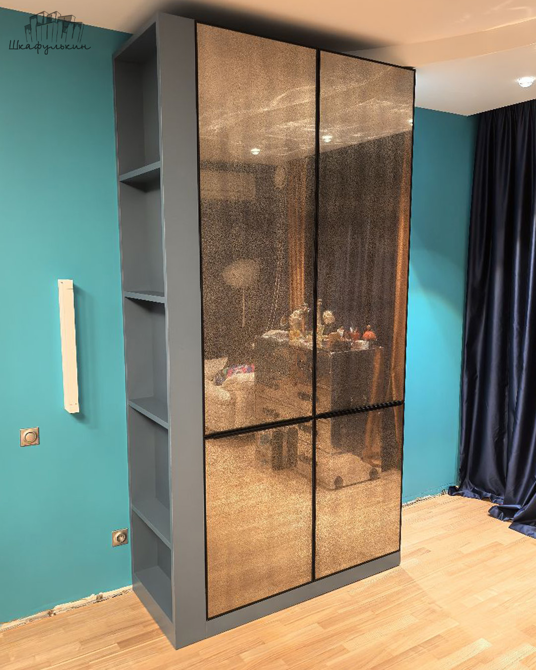 Фасады: алюминиевый профиль с зеркалом.