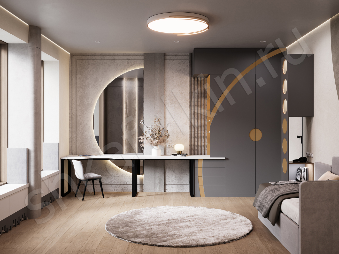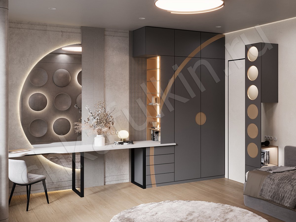 Для юноши, которому нужна не просто детская комната, а целая вселенная для игр и мечтаний, мы создали уникальный проект под названием "Соларис". Главный запрос — круги. И мы пошли до конца: вся мебель в комнате — от кровати до шкафа, от стола до полок — выполнена в форме и с элементами круга. Это не просто стиль, это концепция.