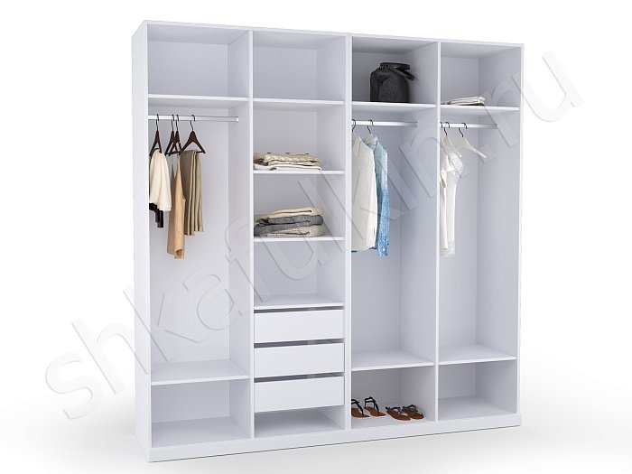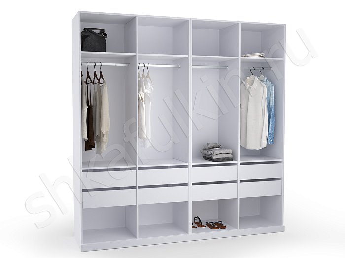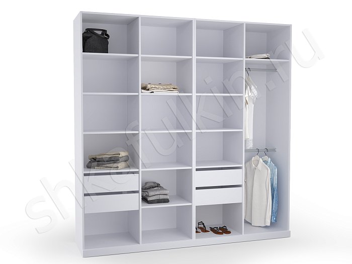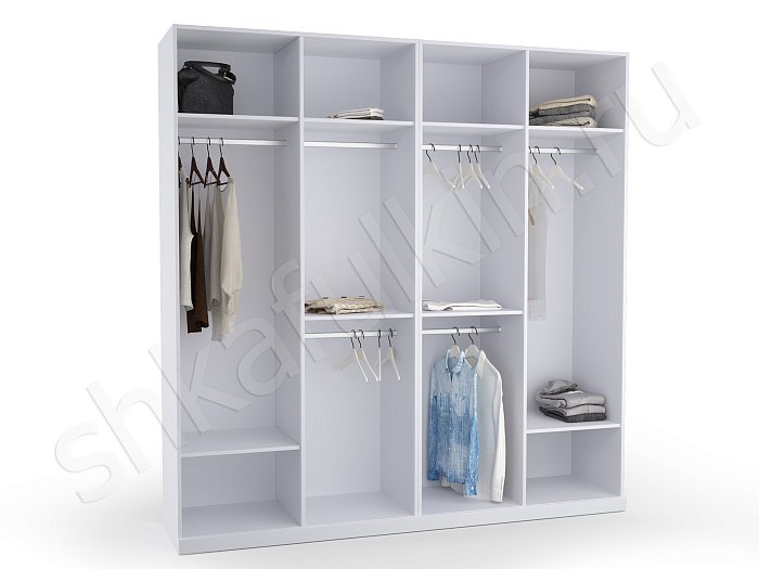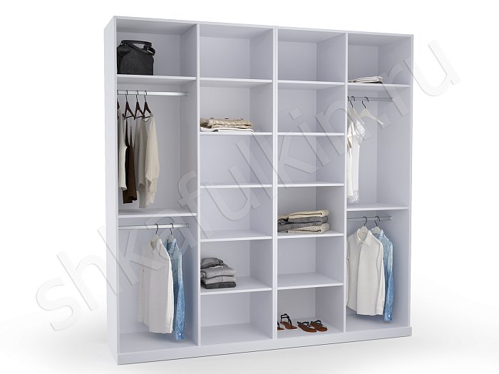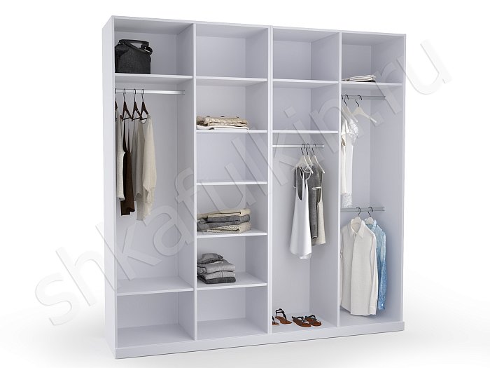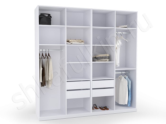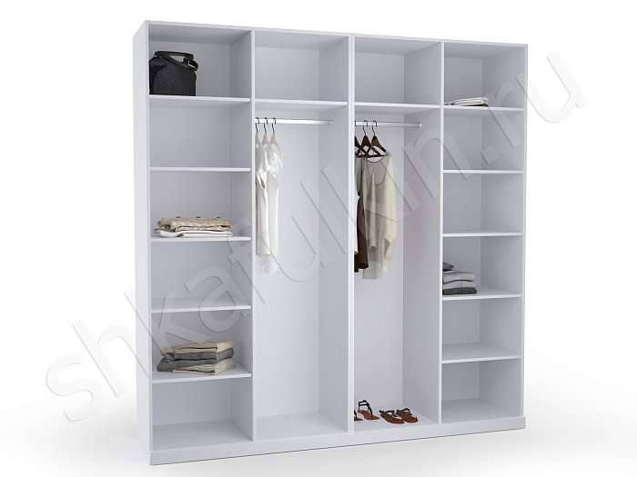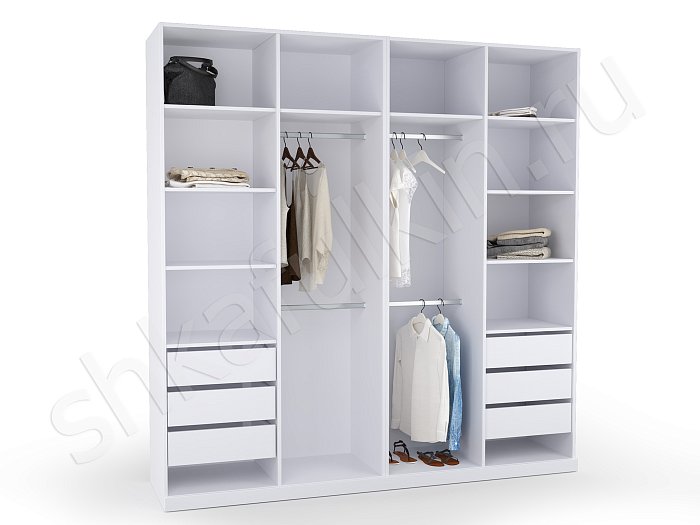 - В данном разделе вы сможете подобрать внутреннее содержание для 2-х, 3-х, 4-х, 5-ти створчатых конструкций. Схемы разрабатывались с соблюдением правильных пропорций, оптимального расстояния между полками, при котором удобно хранить, брать и складывать одежду. Учитывалась высота штанги, с которой легко снимать вешалки. Если она располагается выше 2 м, в таком случае система оснащается пантографом (лифтом).