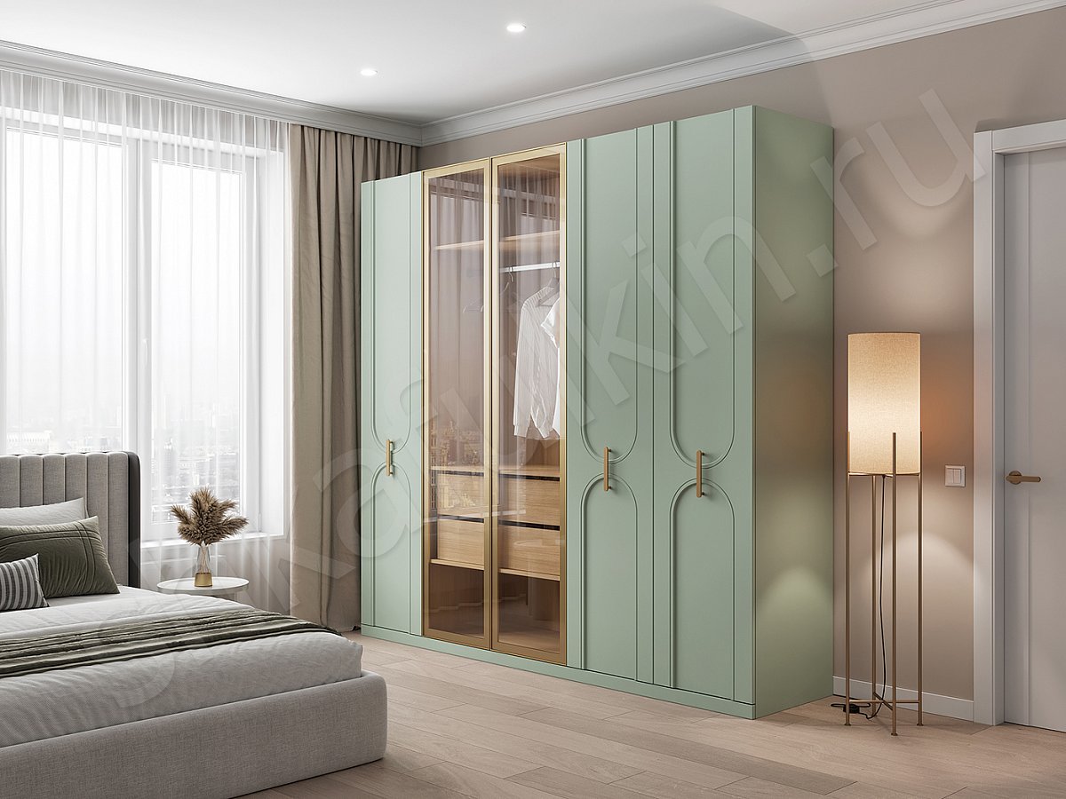 Комбинированные фасады — это игра контрастов: фрезерованные глухие и гладкие стеклянные, которые создают визуальный баланс и подчёркивают индивидуальность пространства. Мы добавили золотые элементы, в виде ручек и профиля, чтобы создать акцент на элегантности.