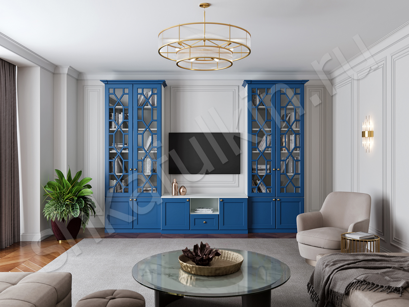 Гарнитур Смит с авторской фрезеровкой идеально дополнит гостиную или спальню в стиле современной классики или в стиле модерн. Атмосферу и уют могут подчеркнуть небольшие элементы интерьера, такие как статуэтки, антикварное покрытие мебели с белой краской, различные вазы из керамики и прочее.