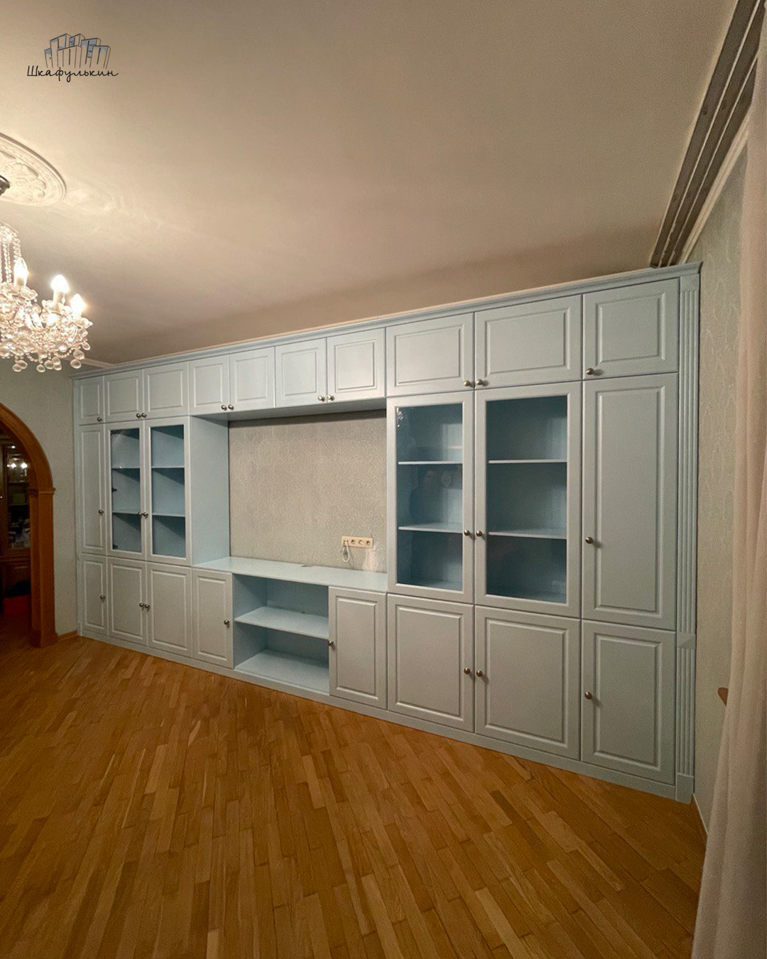 Вместительная стенка имеет просторное место под ТВ или проектор и множество полок для хранения книг и других мелких вещей.